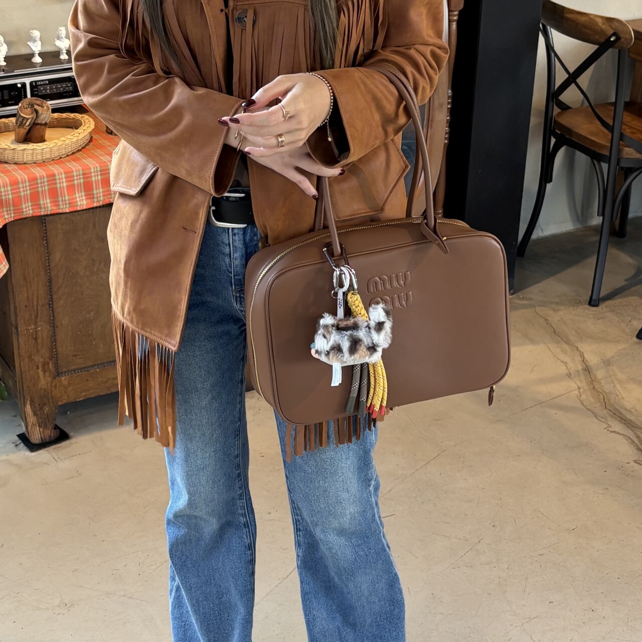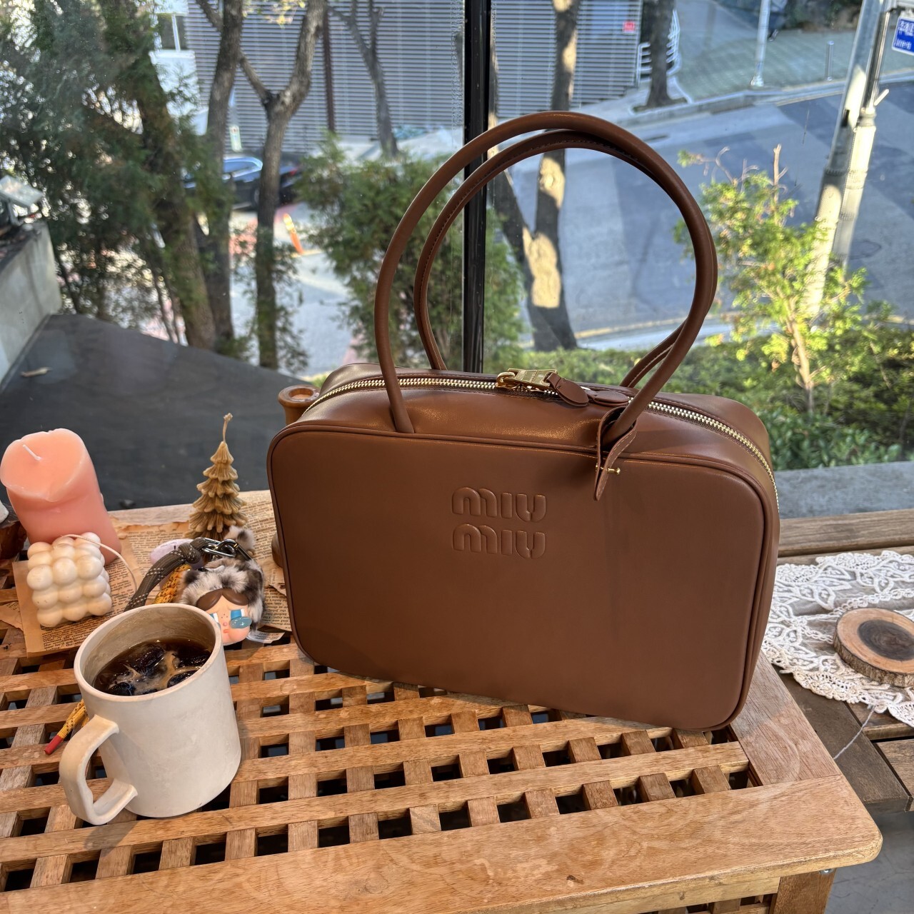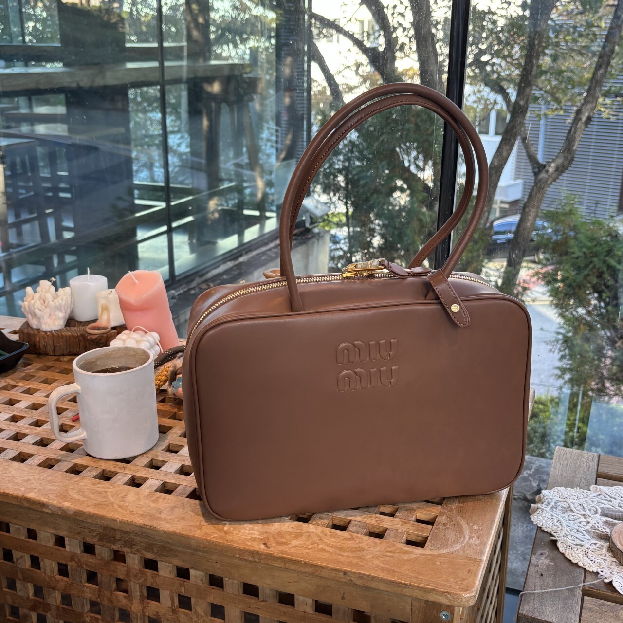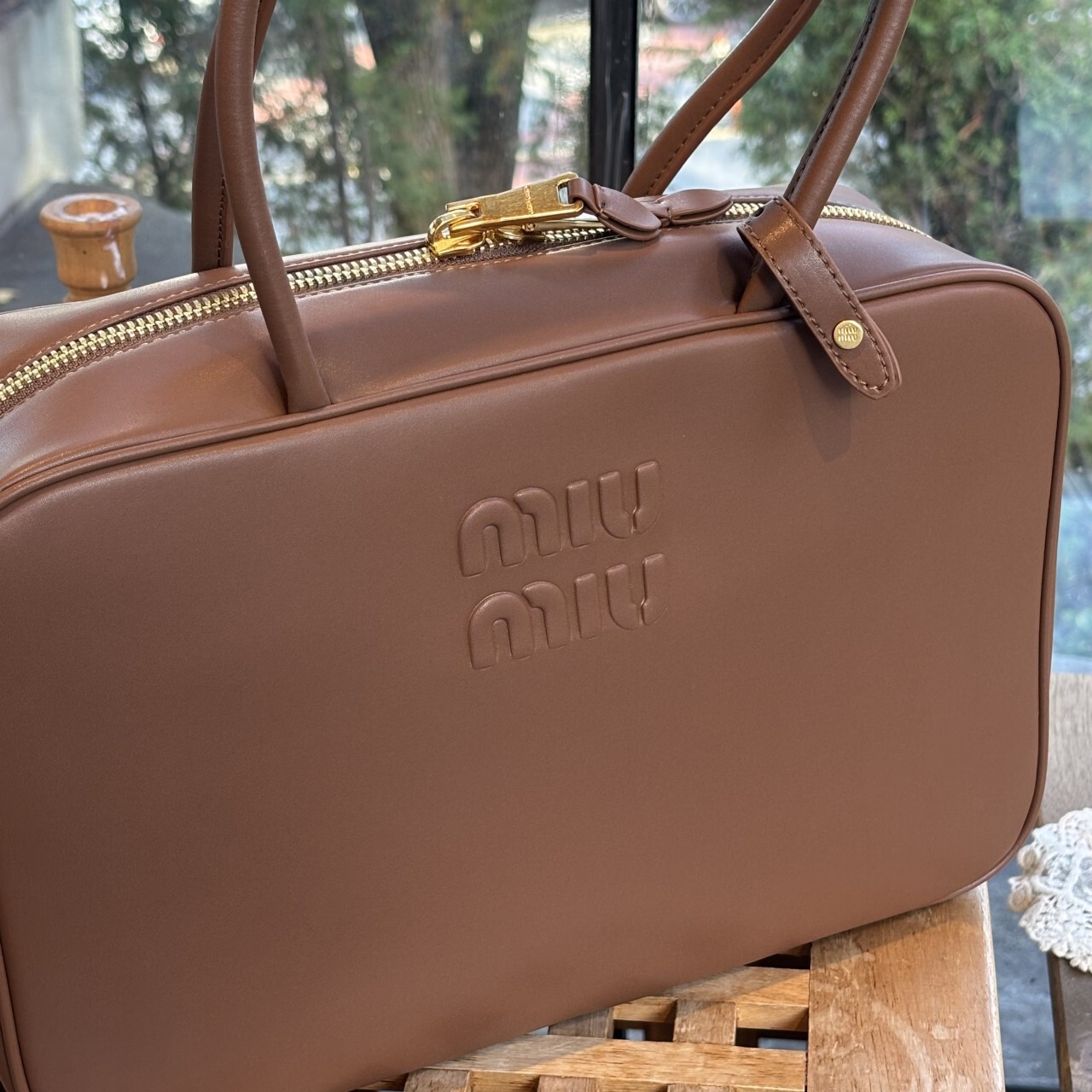미우미우 가죽 보 백 브라운최상급 가죽구성품: 더스트구성사이즈 : 높이 23cm폭 34cm 길이 10cm색상 : 브라운핸드백 또는 숄더백으로 사용 가능한 가죽 핸들골드톤 하드웨어전면 엠보싱 레터링 로고지퍼 클로저더블 지퍼 포켓이 달린 코튼 새틴 라이닝