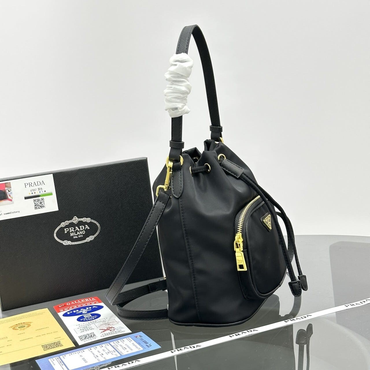 프라다 듀엣 리나일론 버킷 백 (1BH038_RV44_F0002_V_UOP)• • 사이즈: 22.5 x 17.5 x 12 cm • 오후 5시 이전 당일배송 제품 • 스튜디오 에서 현물로 촬영한 실사입니다. 현대적이고 기능적인 개성을 담아낸 부드럽고 활용도 높은 디자인의 프라다 듀엣 버킷 백입니다. 리나일론 소재로 제작된 액세서리로 외부 지퍼 포켓이 특징이며, 손으로 들거나 가죽 숄더 스트랩으로 크로스바디 백으로 착용할 수 있습니다