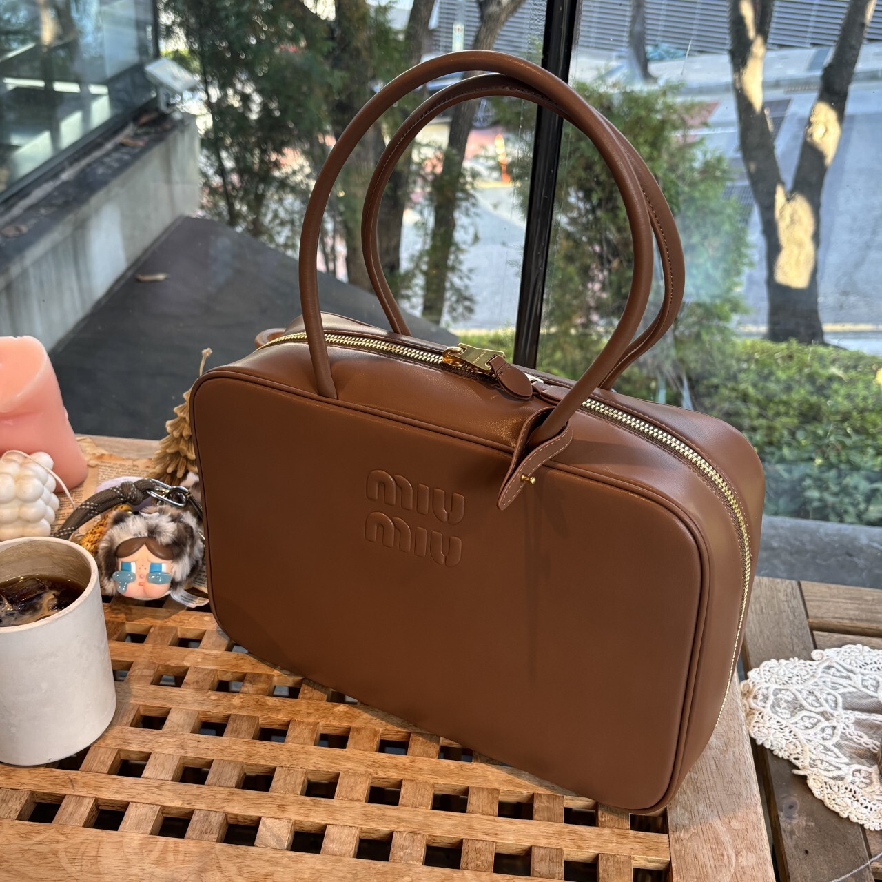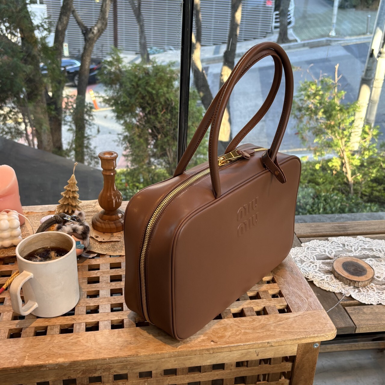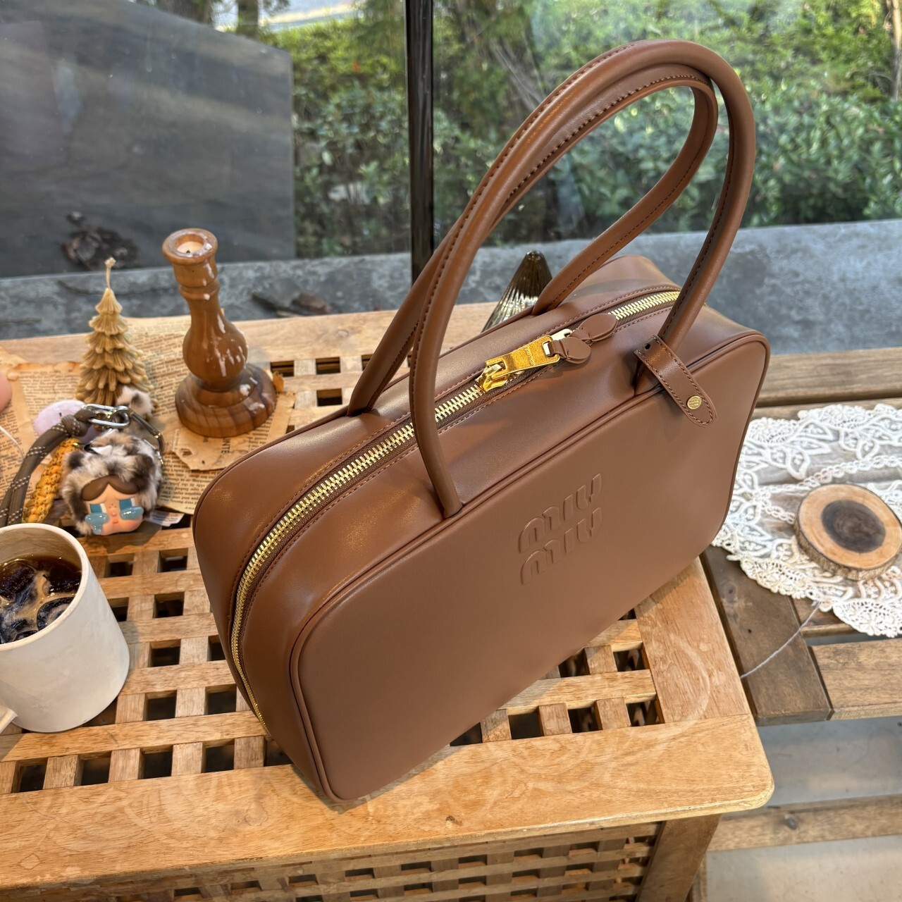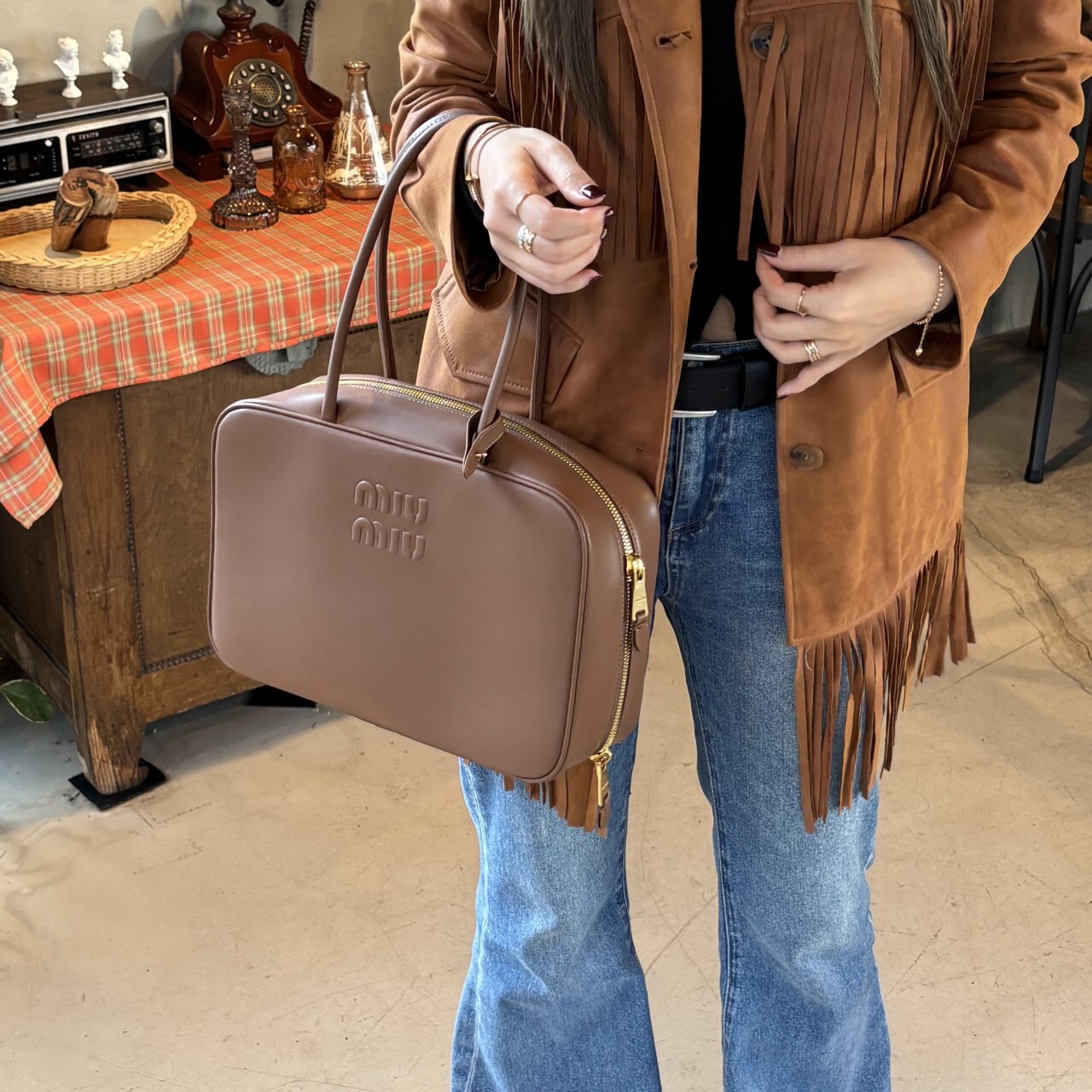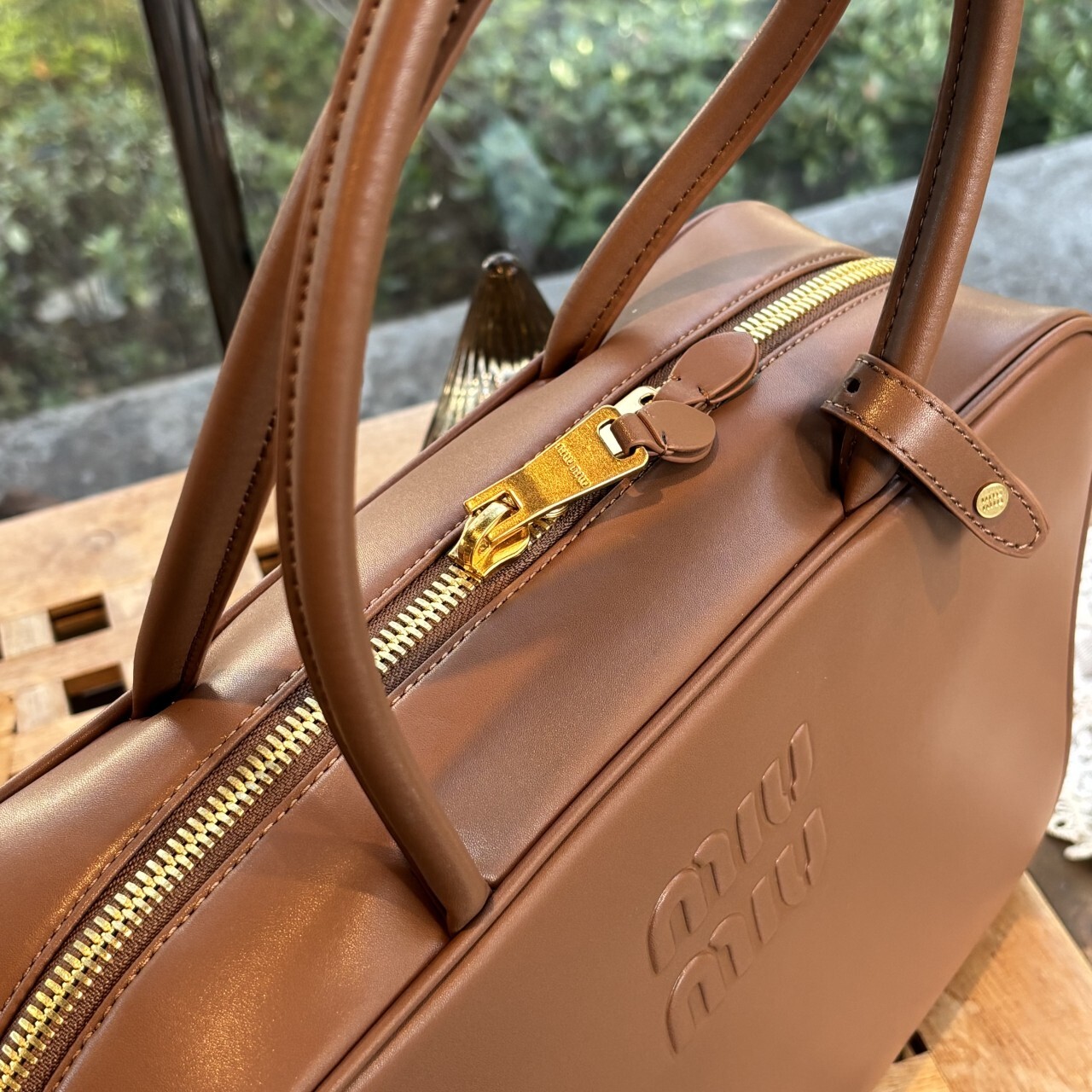 미우미우 가죽 보 백 브라운최상급 가죽구성품: 더스트구성사이즈 : 높이 23cm폭 34cm 길이 10cm색상 : 브라운핸드백 또는 숄더백으로 사용 가능한 가죽 핸들골드톤 하드웨어전면 엠보싱 레터링 로고지퍼 클로저더블 지퍼 포켓이 달린 코튼 새틴 라이닝