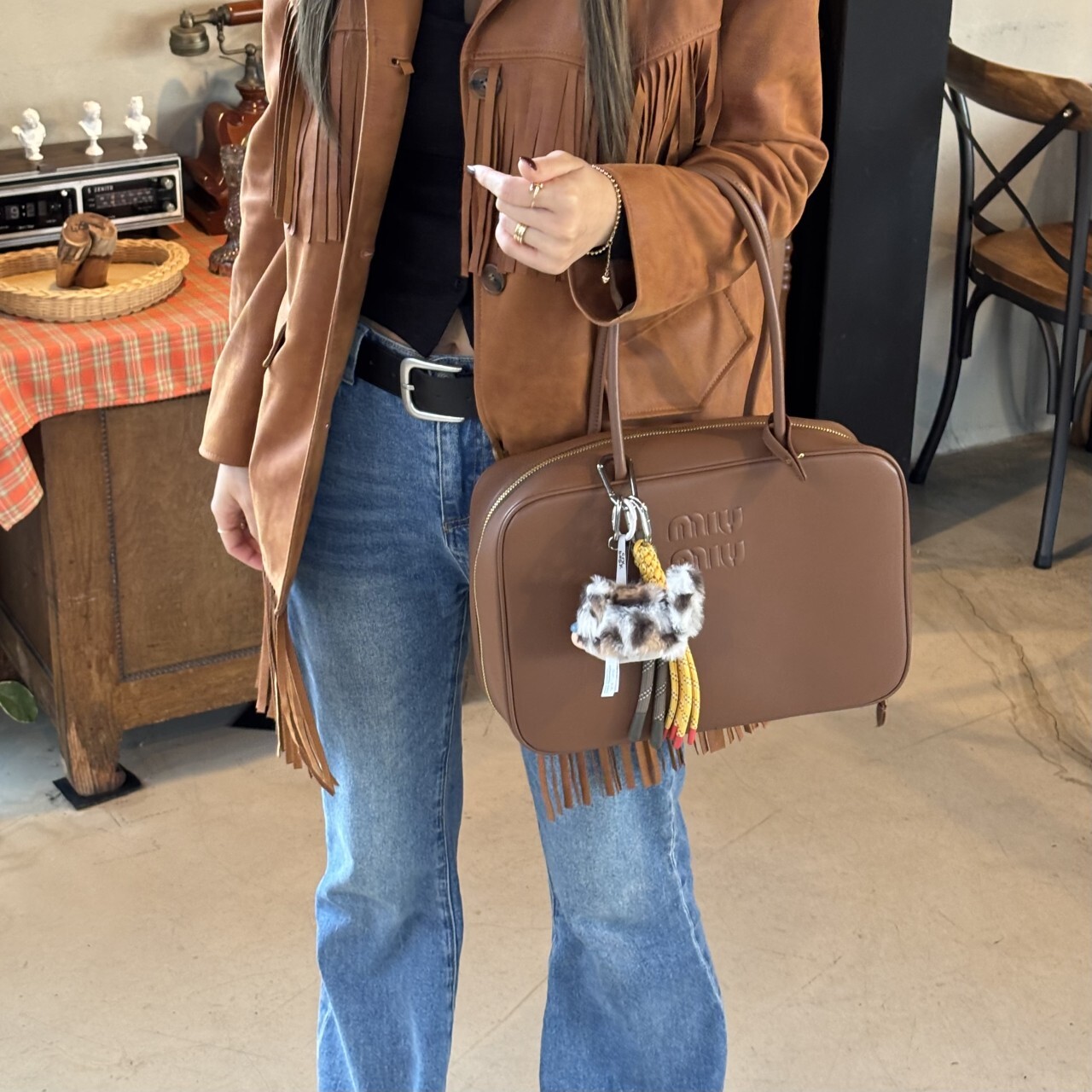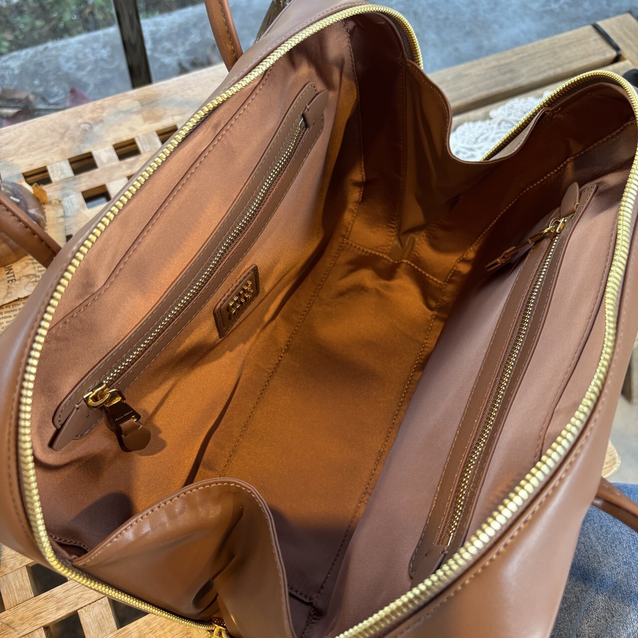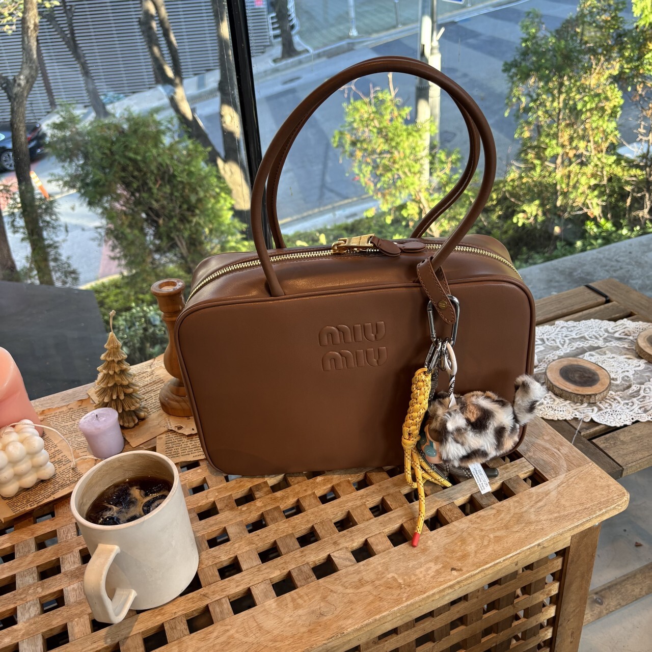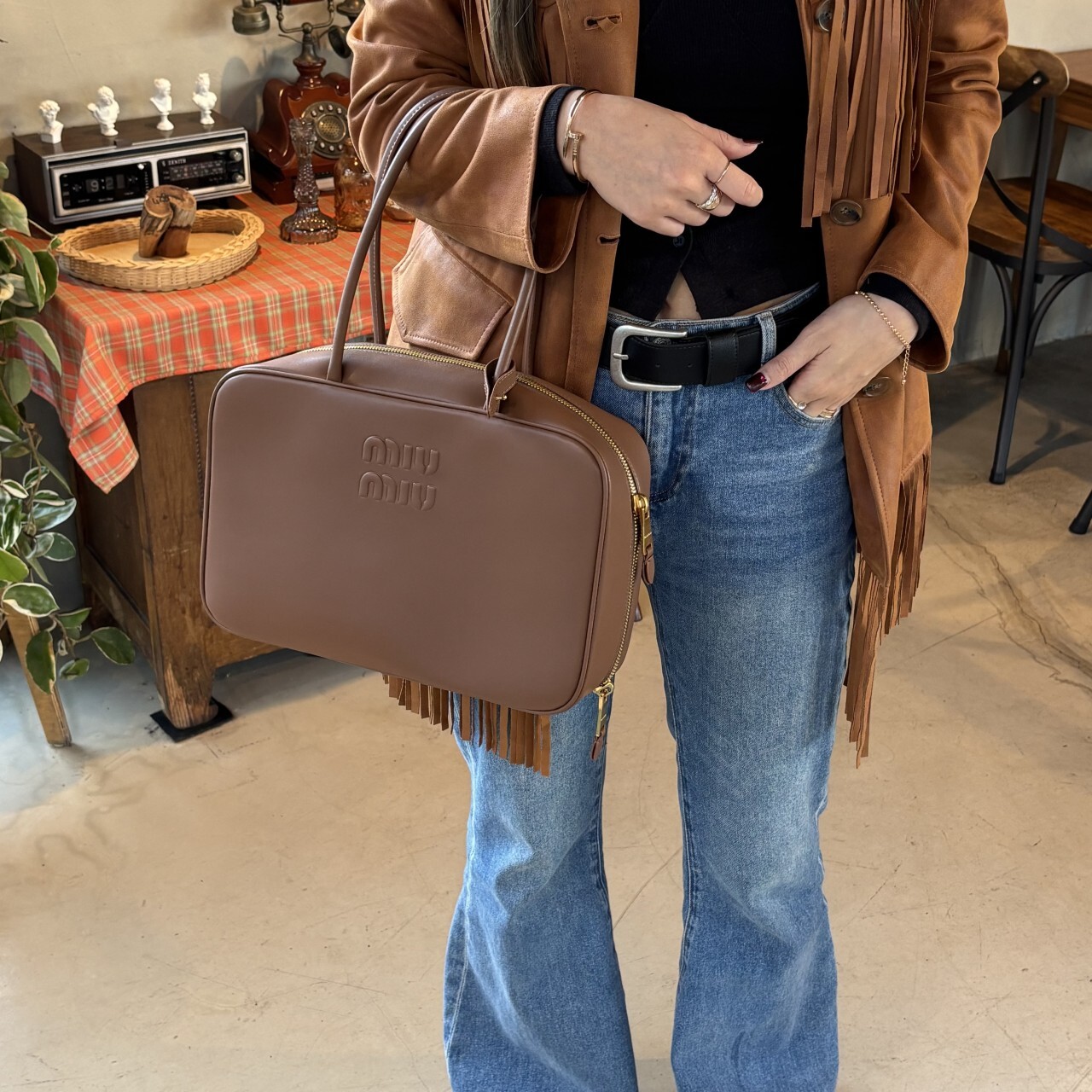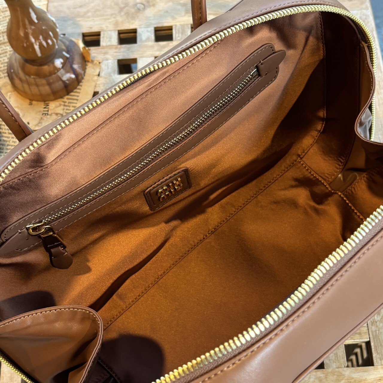 미우미우 가죽 보 백 브라운최상급 가죽구성품: 더스트구성사이즈 : 높이 23cm폭 34cm 길이 10cm색상 : 브라운핸드백 또는 숄더백으로 사용 가능한 가죽 핸들골드톤 하드웨어전면 엠보싱 레터링 로고지퍼 클로저더블 지퍼 포켓이 달린 코튼 새틴 라이닝